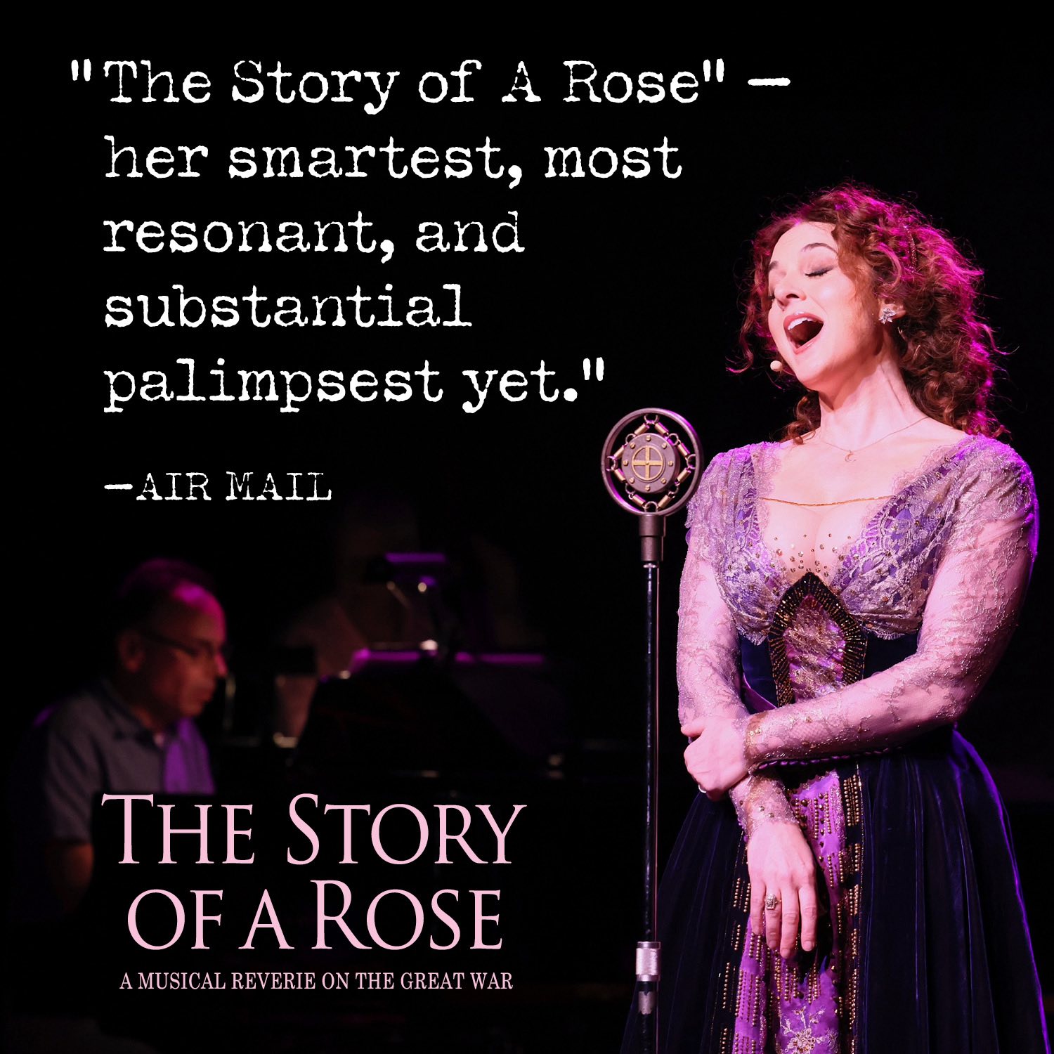 With her trademark smarts and sublime singing, Melissa Errico tells the story of her own great Aunt Rose and her grandmother as they came over from Italy by boat during WW1 and immediately took up work as seamstresses at the Brooklyn Navy Yard making uniforms for the war. A musical memoir full of early jazz ragtime flair & elegant storytelling, Melissa pieces together love letters, authentic songs, stories of friendships, and scraps of the memories of lovers & sons to bring another time back into focus. She will stir our hearts to recall how life, for an entire generation, would never be the same again. This Rose becomes a memorial for many.